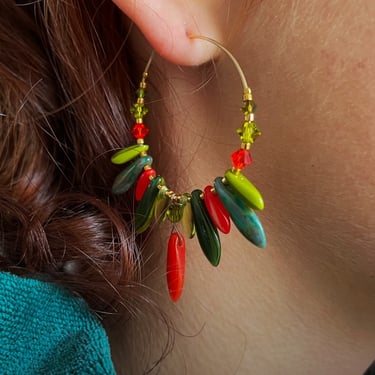 Au printemps 2012, alors que cette question refaisait surface et que je la portais intérieurement, la présentant à Dieu dans la prière, j’ai été éclairée par l’écoute d’une émission radio sur la Parabole des Talents (Evangile selon Saint Matthieu XXV, 14-30). L’orateur expliquait que le “mauvais serviteur”, qui avait enfoui son talent dans la terre sans le faire fructifier, l’avait fait par peur. J’ai reçu ce mot fortement en réalisant que beaucoup de peurs pouvaient me retenir dans l’expression de mes talents. Peur de ne pas savoir, peur de ne pas avoir le temps ou l’énergie de conjuguer vie familiale et activité artistique… J’ai alors décidé de poser de petits actes concrets: je me suis fait percer les oreilles et me suis lancée dans la confection de boucles d’oreilles assorties à mes tenues. Très vite encouragée par mes amies, j’ai décidé d’en créer de toutes sortes pour les leur proposer. J’ai créé plus de cent modèles différents dans les mois qui ont suivi. J’ai ressorti mes pinces de chirurgien-dentiste, pinces très fines et précises qui me permettent un travail soigné et de qualité. Ce métier que je n’avais pas exercé depuis près de 20 ans m’était encore au bout des doigts. Les sensations et les souvenirs me revenaient en mémoire avec une certaine émotion. Mes filles papillonnaient dans mon atelier, manipulant les perles à leur tour, me proposant des idées, me tenant compagnie pendant des heures, s’y mettant elles aussi. La perspective de vendre mes bijoux stimule beaucoup ma créativité, avec parfois des défis à relever par des commandes. J’aime la rencontre et l’échange suscités par ce biais.