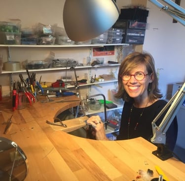 L’atelier de bijoutier est un lieu de travail et de minutie, où chaque détail est considéré afin de concevoir un bijou en harmonie de formes, de couleurs et de matières. Réalisés avec finesse et passion, les heures ne sont plus comptées quand il s’agit de créer des compositions variées, aux finitions toujours soignées. J’aime avoir à portée de main mes casiers de perles, classées par couleur, comme autant de palettes de peintre. La variété des couleurs et la qualité des matériaux me procurent bien-être et énergie.